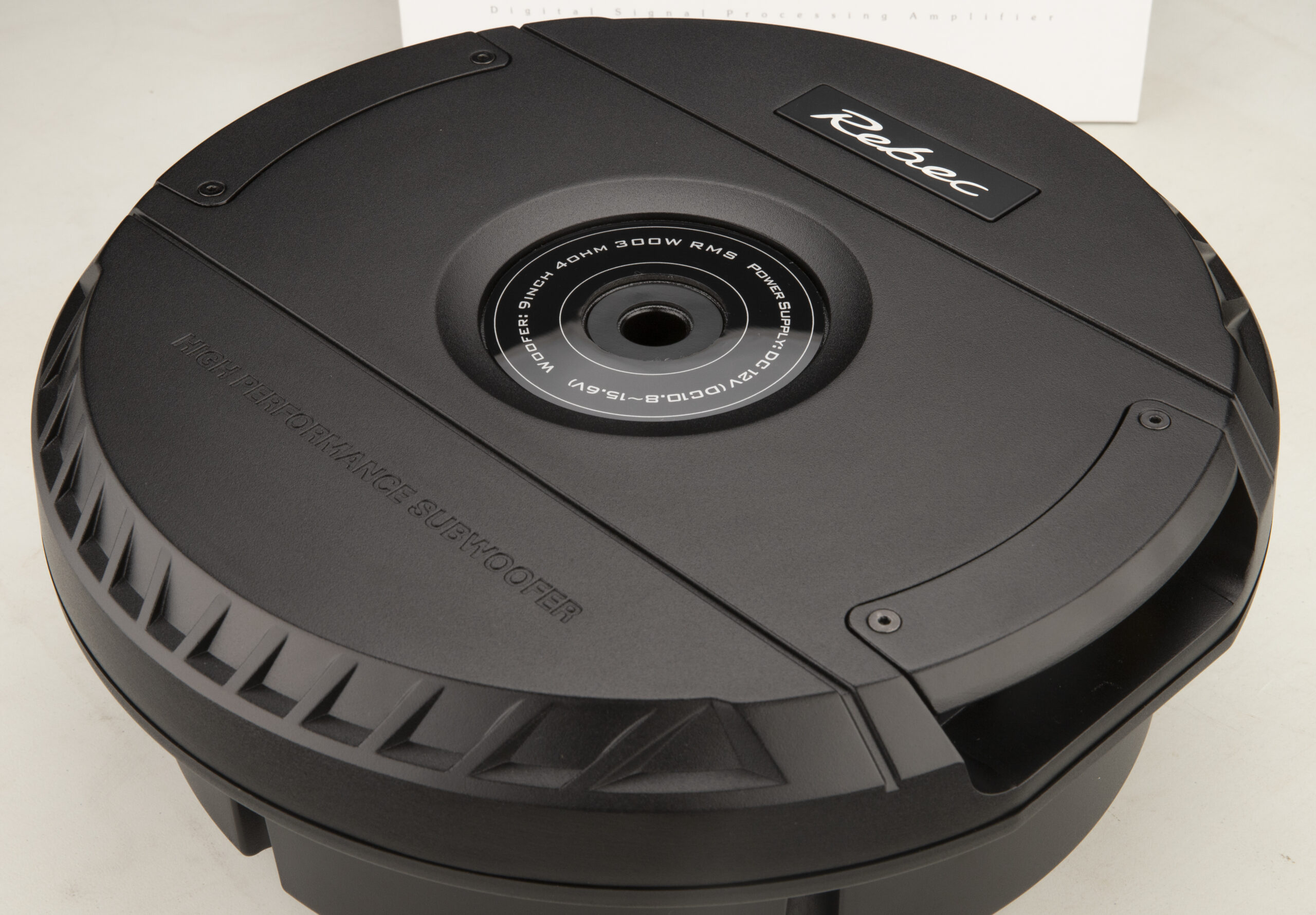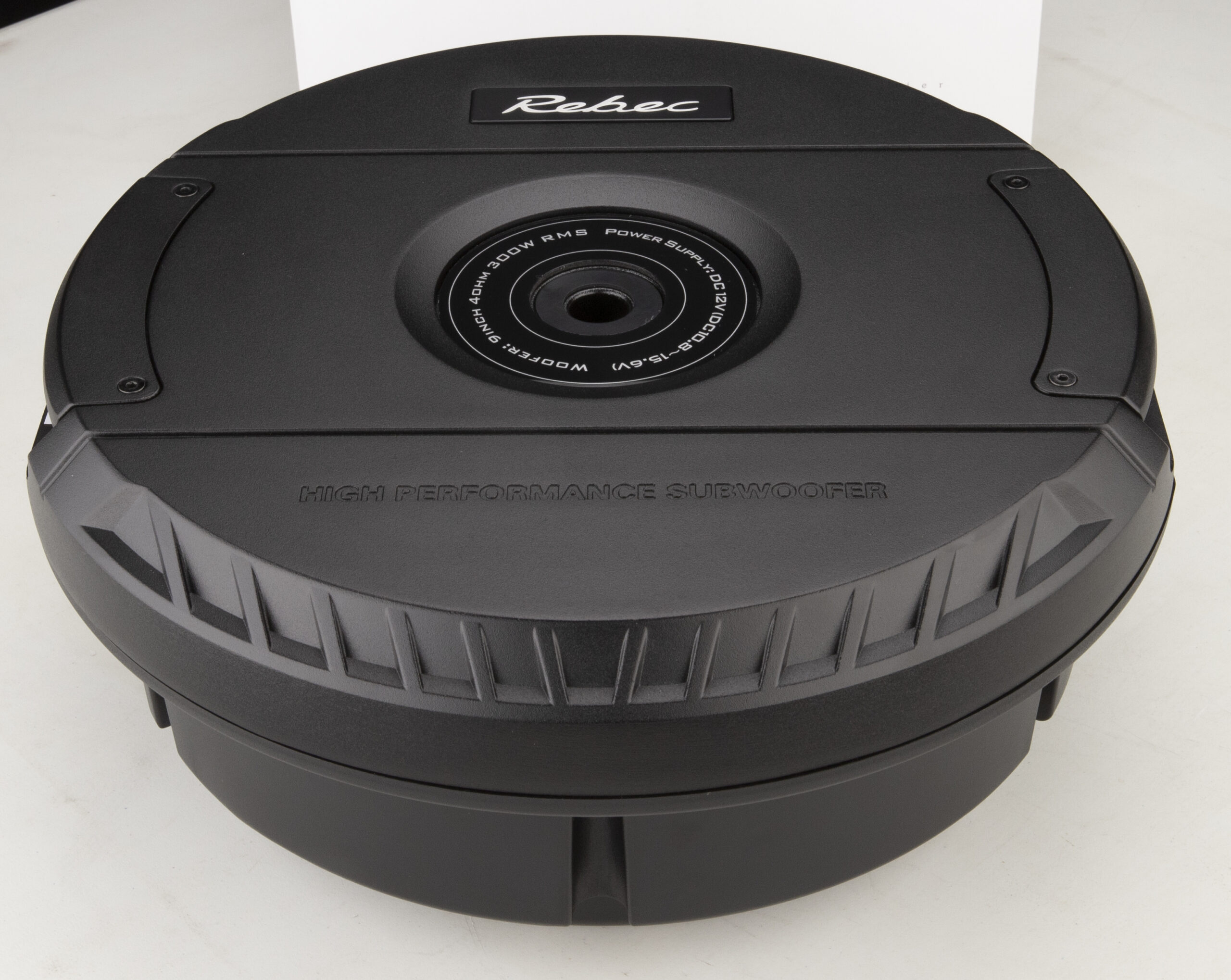 Aktywny subwoofer typu „koło zapasowe” w rozmiarze 9″, o mocy RMS 300W i oporności 4 Ohm.